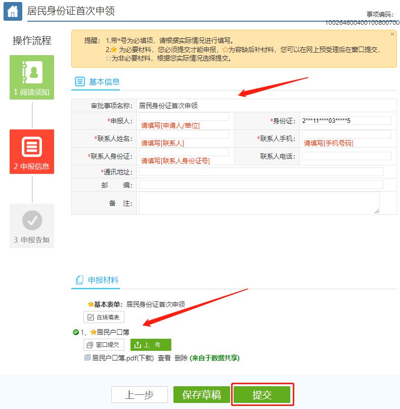 填写基本信息,基本表单下的在线填表和材料上传,确认无误后点击提交。