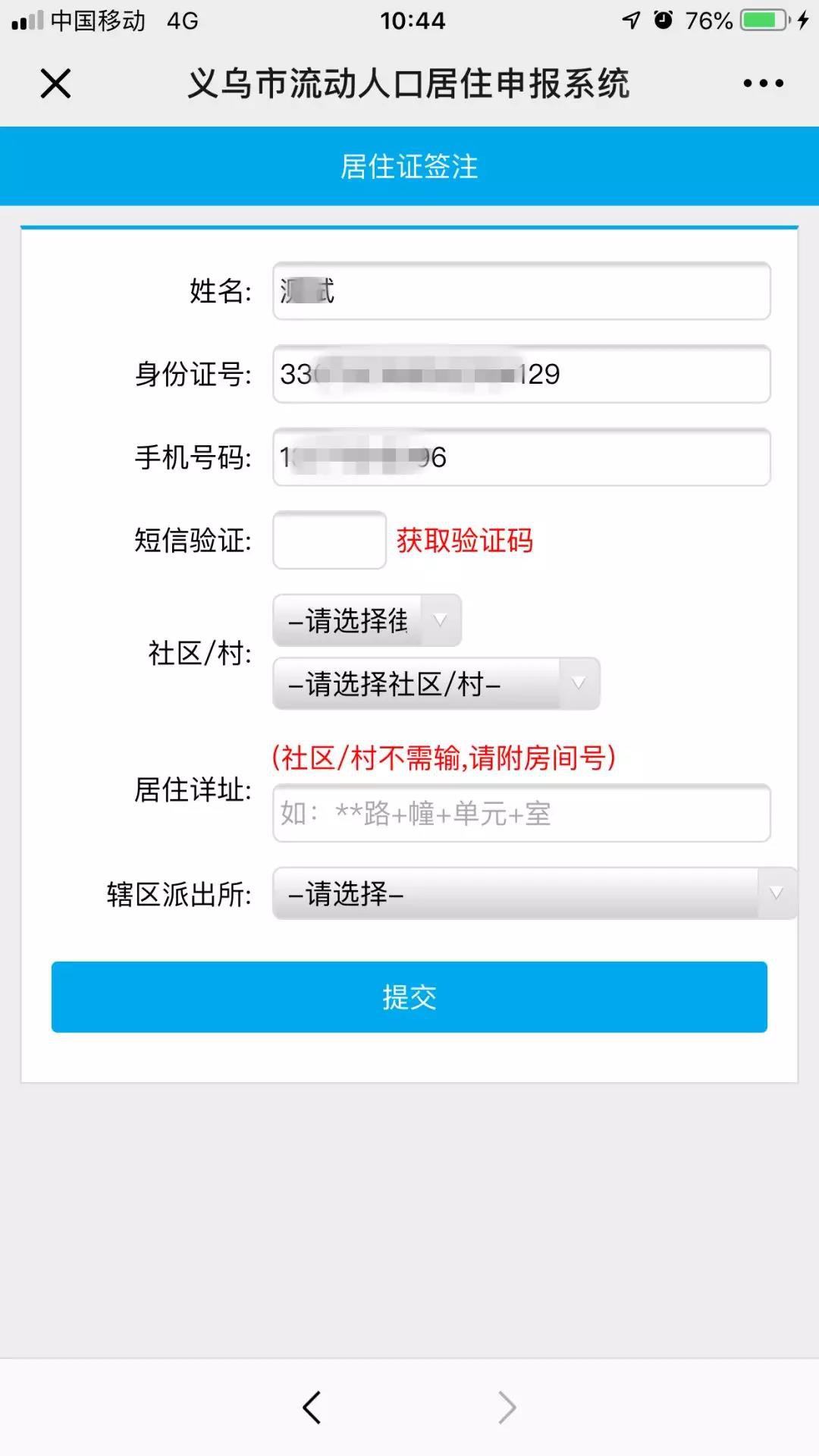 如实填写姓名、身份证号、手机号、现居住地址及所属派出所等信息,点击提交即可。