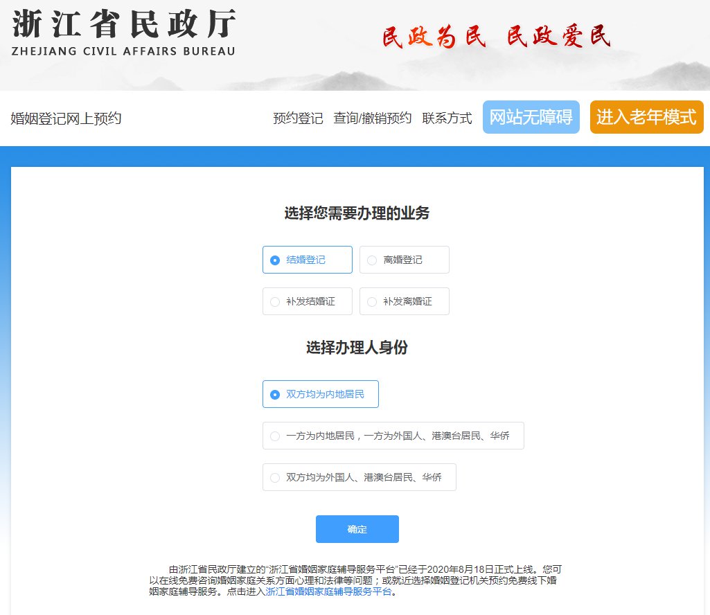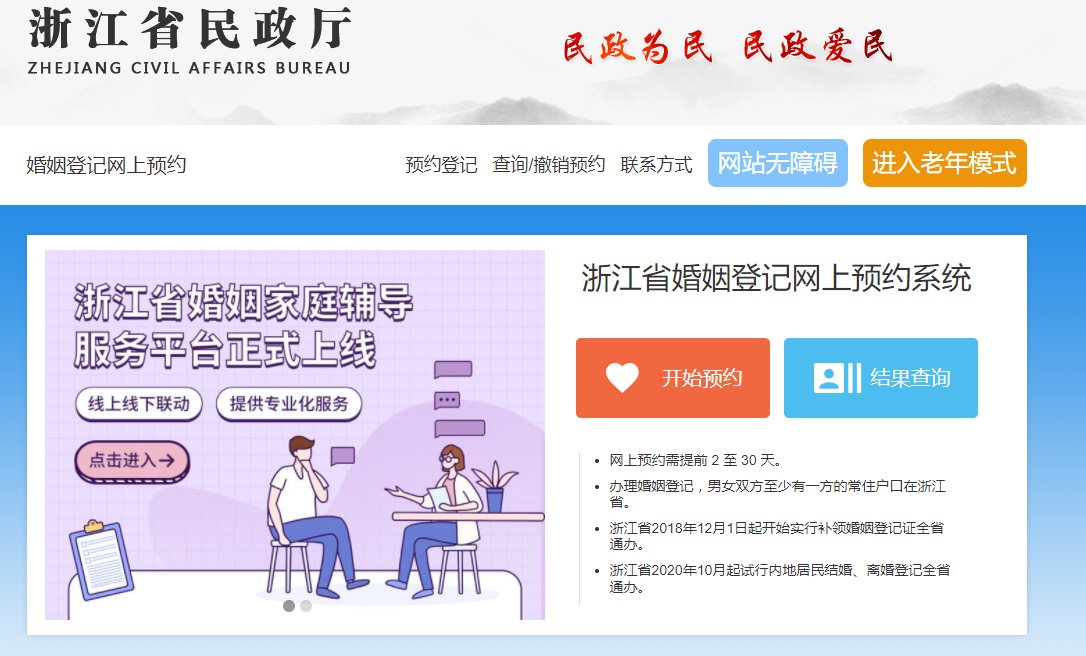 1、点击“浙江省婚姻登记网网上预约”链接,进入“预约结婚登记”页面