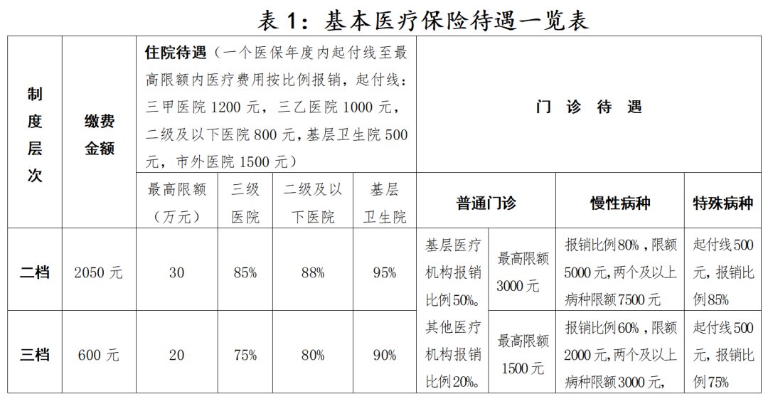 表1:基本医疗保险待遇一览表
