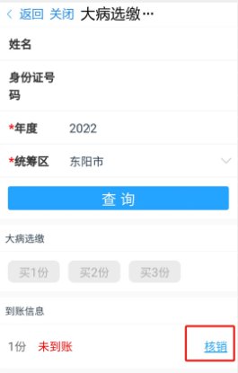 2、选择“本人大病选缴缴费”,点击查询,可查看本人已选缴的份数及是否到账信息