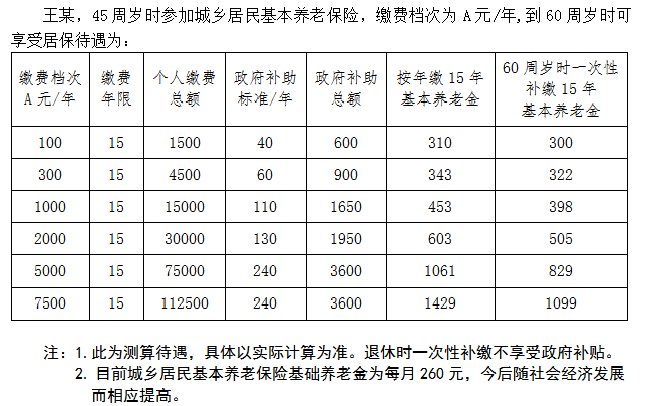 举例说明,王某在45周岁时参加城乡居民基本养老保险,缴费档次为每年100元,按年缴满15年,其个人缴费总额为1500元,基本养老金为每月310元。如王某缴费档次选择每年7500元,按年缴满15年,基本养老金可达每月1429元。如果参保者在60周岁时一次性补缴15年的(退休时一次性补缴不享受政府补贴),按6个不同缴费档次计算,每月到手的基本养老金分别为300元、322元、398元、505元、829元、1099元。(以上为测算待遇,仅供参考,具体以实际计算为准)