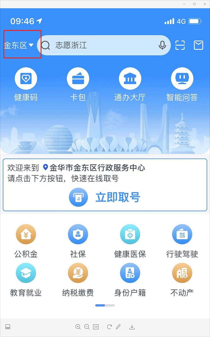 手机登录“浙里办”APP,定位选在“金东”,首页搜索“个体劳动者(灵活就业人员)参保登记”。