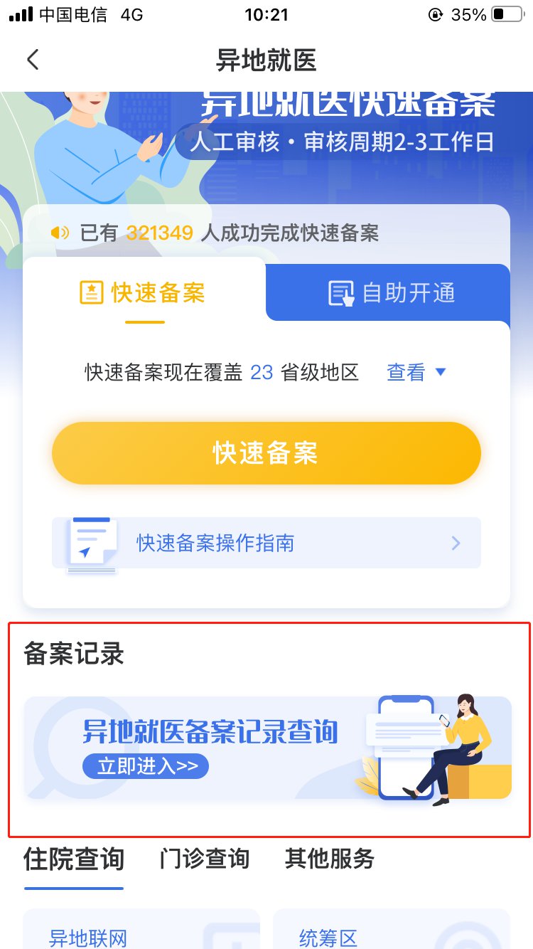 可通过“国家医保服务平台”APP或“国家异地就医备案”微信小程序进行查询,进入“异地就医”模块,点击“异地就医备案记录查询”。