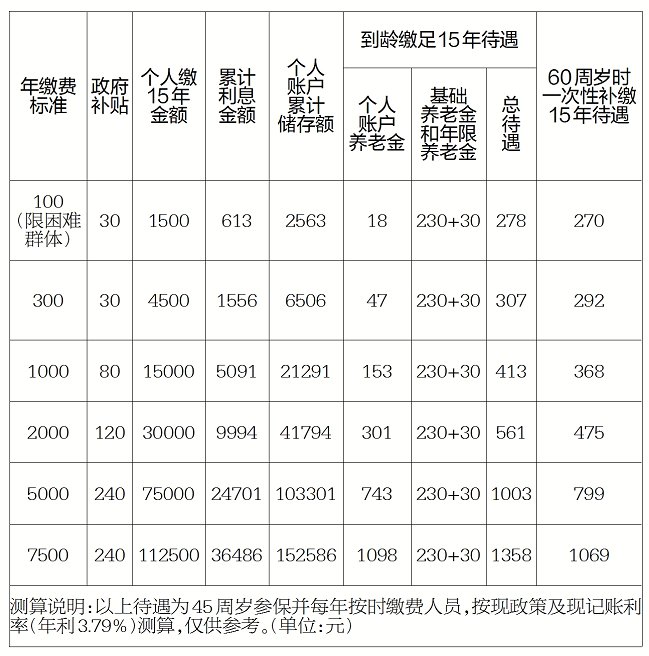 新政实施全民参保登记计划,城乡居民基本养老保险制度缴费档次标准由原12档(100元至1000元每增加100元设一档、1500元、2000元)调整为6档,即每年100元、300元、1000元、2000元、5000元、7500元共6档。其中,100元的档次限低保对象、特困人员、残疾人、低保边缘户等困难群体选择,由财政全额代缴。参保人员需在2020年12月15日前确认缴费档次,可通过银行委托扣款、银行柜台、支付宝、微信、自助机、电子税务局等进行缴费。