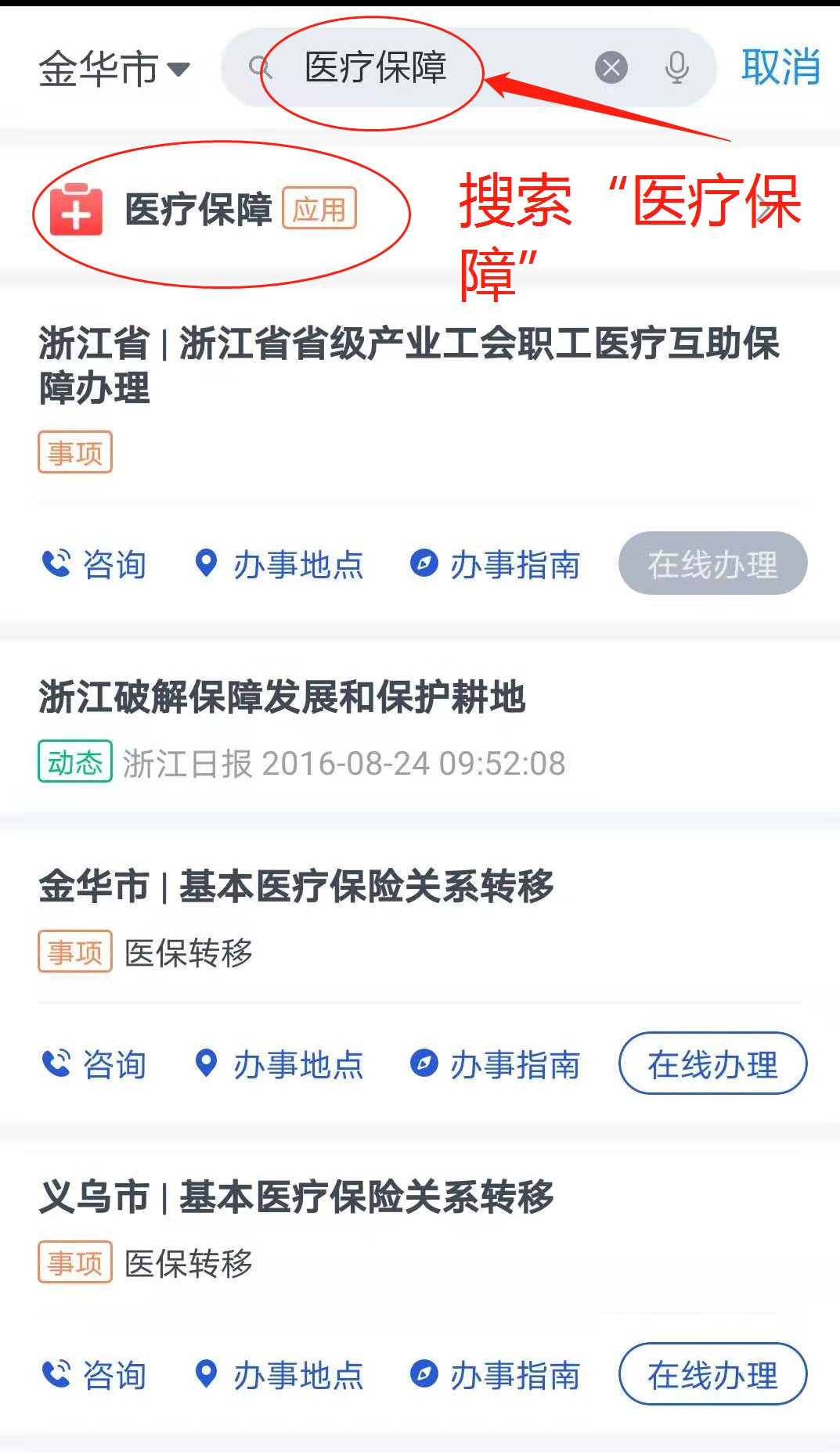 第一步:打开浙里办,定位金华,金华市本级,搜索框内搜索“医疗保障”,点击“医疗保障”或在界面上直接点击 “医保”