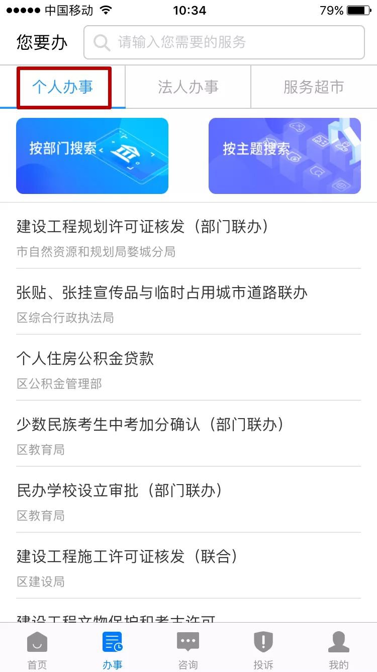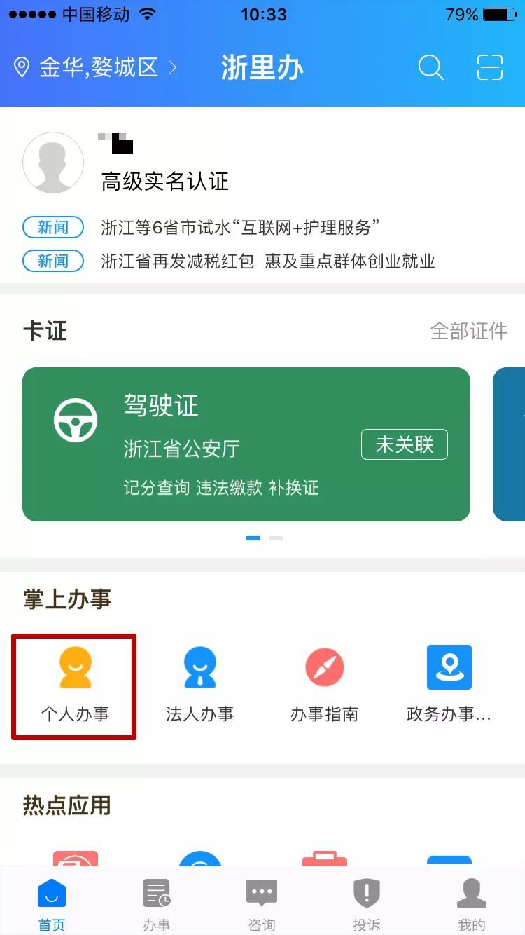 第二步:进入APP,点开“掌上办事”中的“个人办事”。