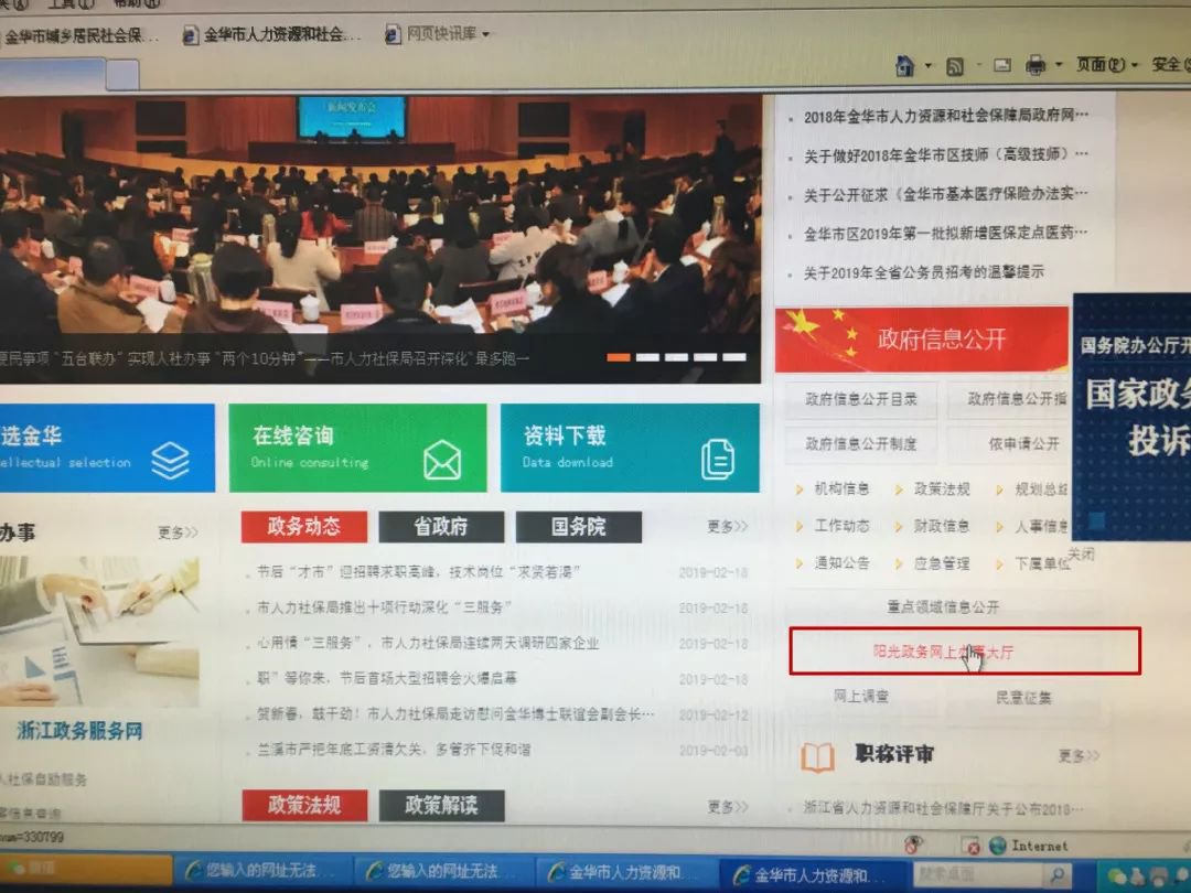第一步,打开“金华市人力资源和社会保障局官网”,点击进入阳光政务网上办事大厅。