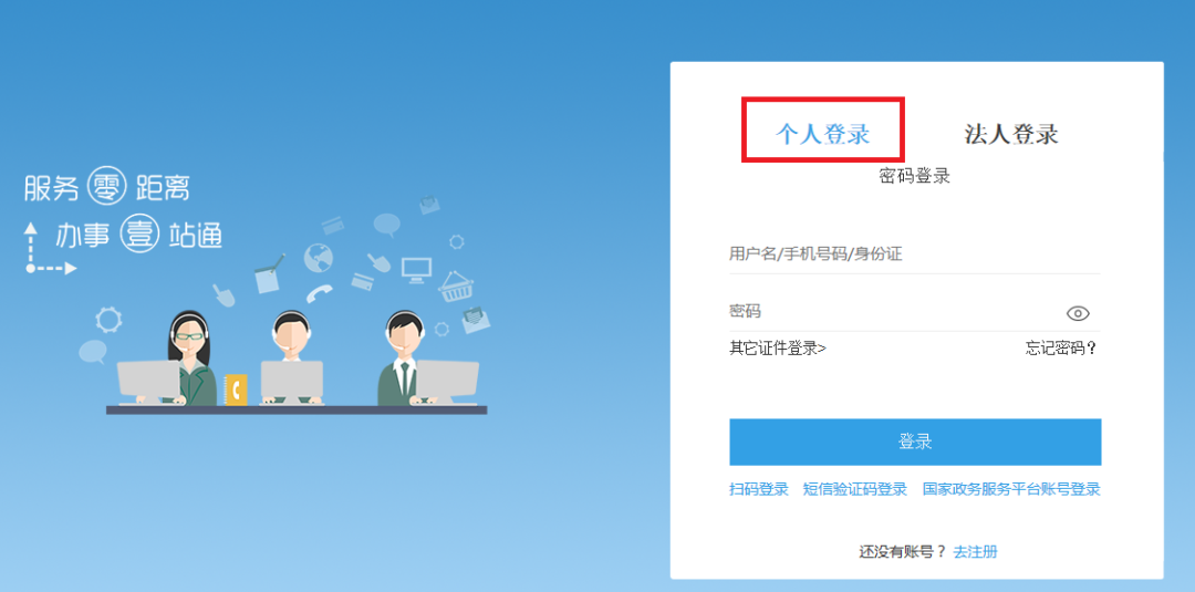 步骤1:企业专管员登录浙江政务服务网-----点击右上角个人登录,完成注册、登录;