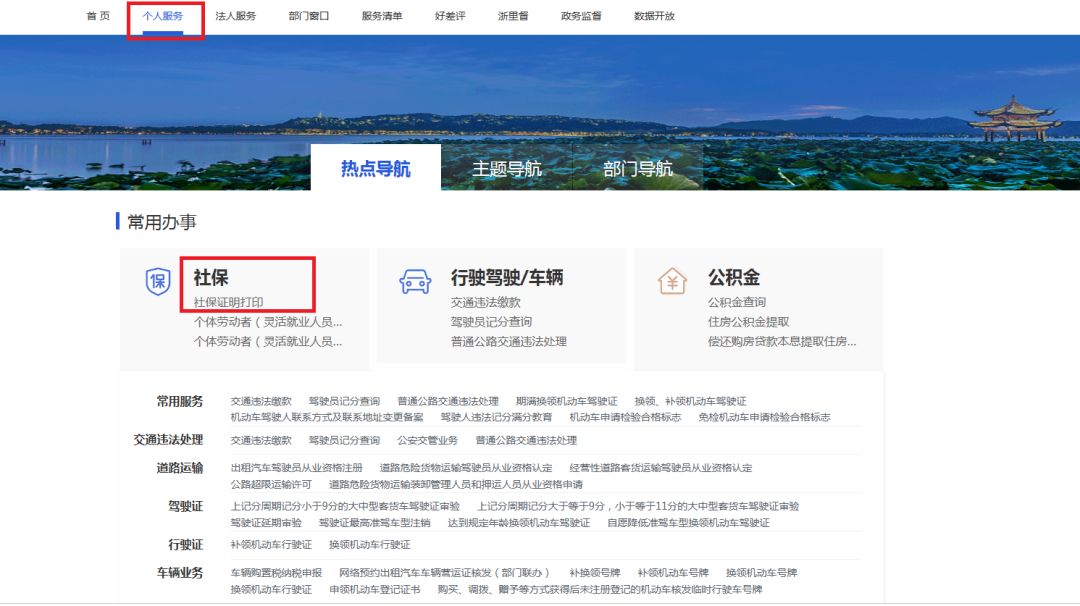 步骤2:点击首页“个人服务”模块,查看“热点导航“----“常用办事“---点击“社保证明打印”----选择“单位社保证明”;