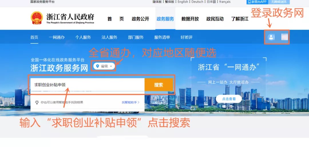 1.“浙江政务服务网”搜索栏输入“求职创业补贴”。