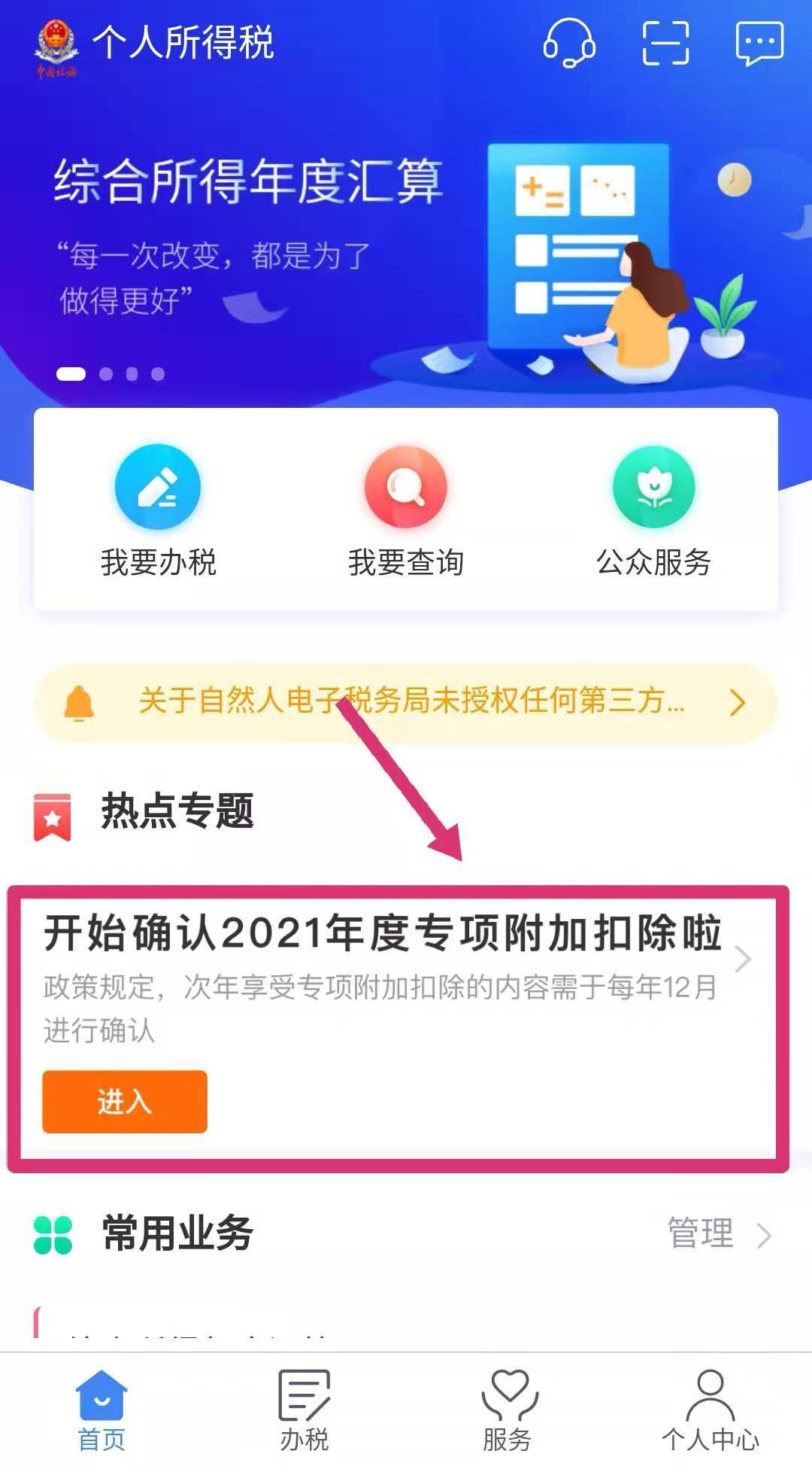 1、打开“个人所得税”APP,在首页可以看到2021年度个税专项附加扣除确认入口。