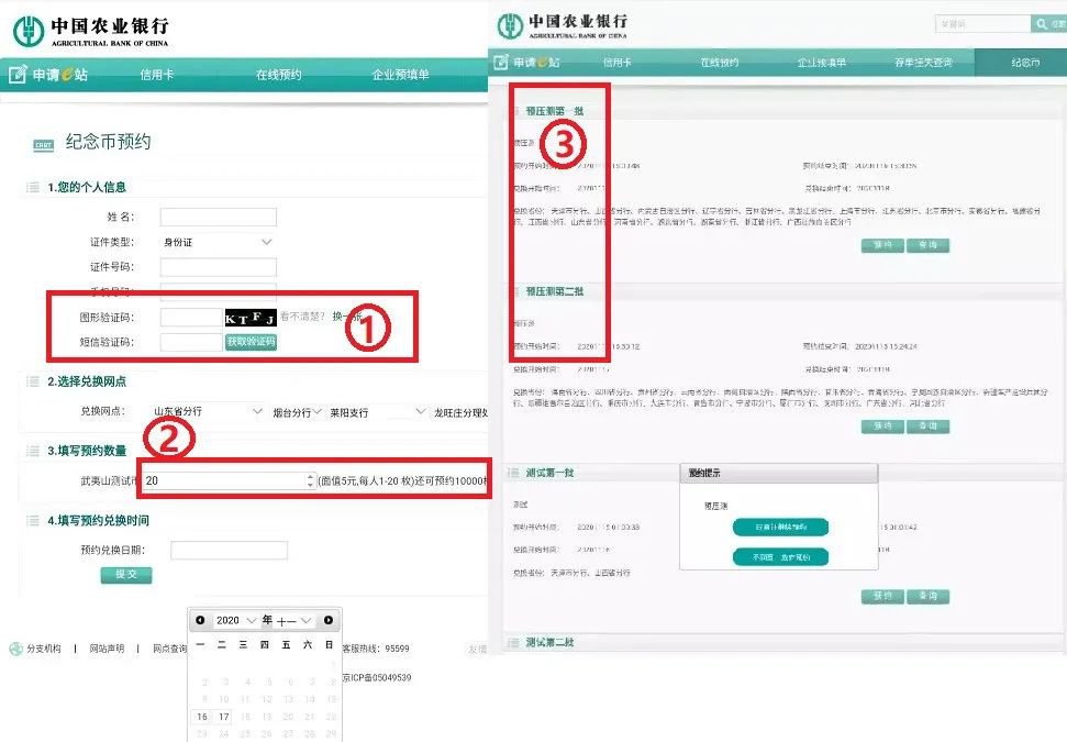 因为农行在这次武夷山币招标中标了,因此将由中国农业银行负责武夷山币预约兑换。目前,农业银行也对预约系统进行了测试,预约入口界面已亮相,如下 ↓↓