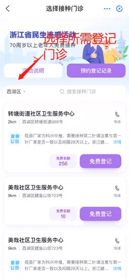 进入民生流感登记界面后根据个人需求选择地区、门诊,点击【免费登记】。