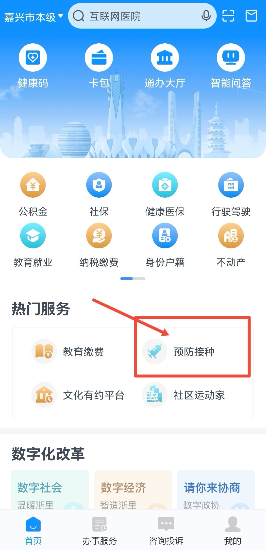 1.进入浙里办APP并登录,在“热门服务”中选择“预防接种”。