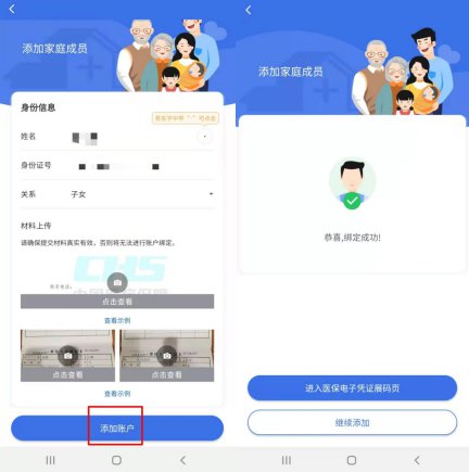 ②上传本人户口本(常住人口登记卡)、被绑定人户口本(常住人口登记卡),点击“添加账户”即可绑定成功。
