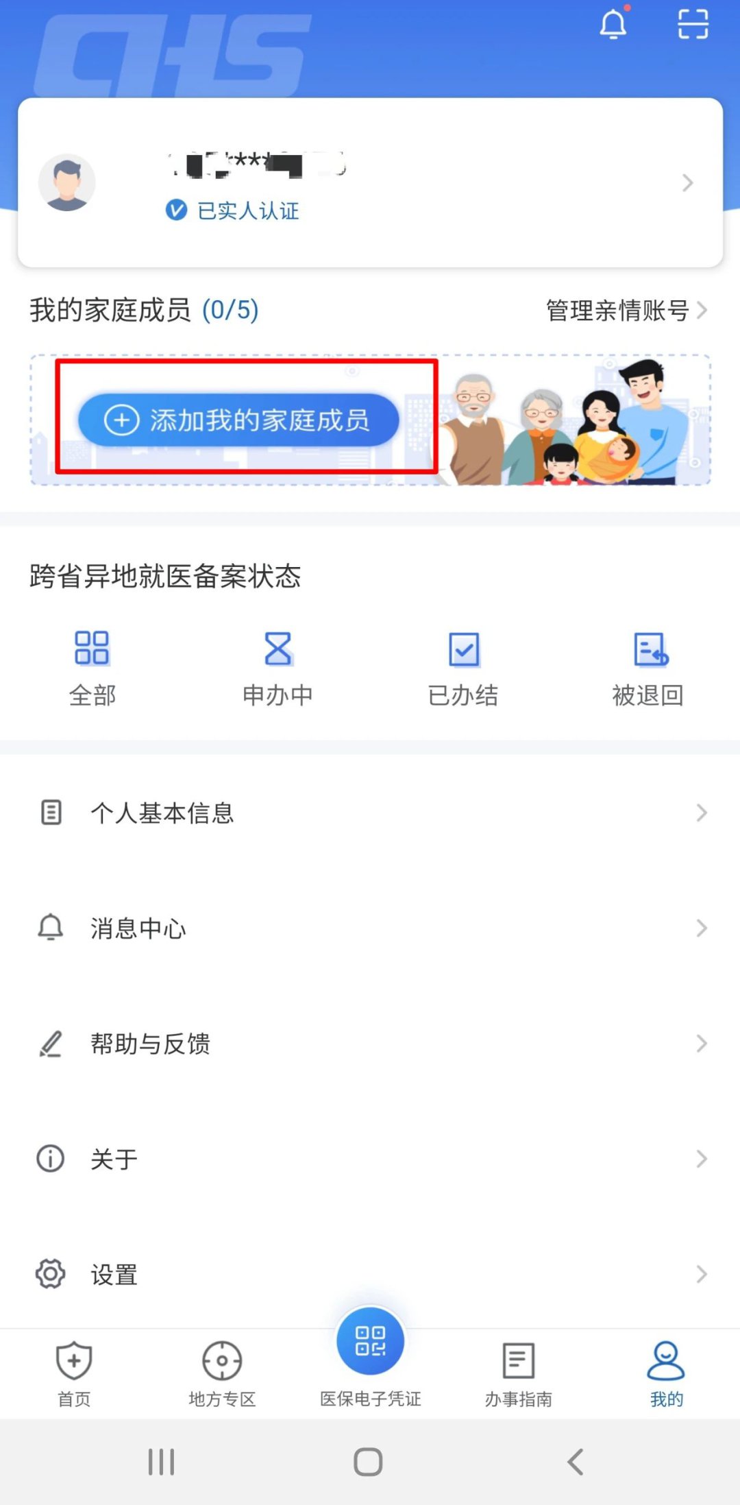 完成登录后,点击底部菜单【我的】进入个人中心页面,在【我的家庭成员】版块点击图标“+”添加亲情账户。