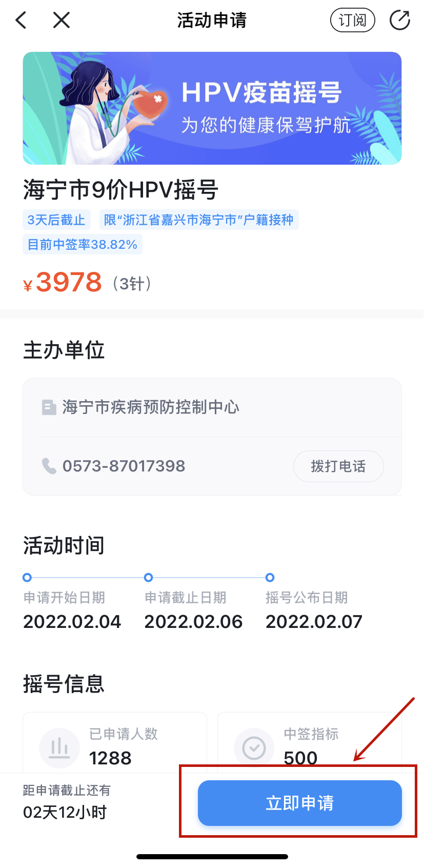 步骤二:进入预防接种页面后,点击“HPV疫苗”,左上角地区切换成“嘉兴市”,选择“9价HPV疫苗”,找到活动后点击“去申请”。