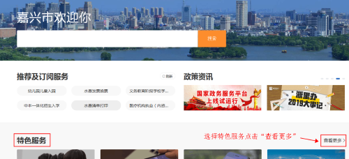 三、在政务网嘉兴首页选择特色服务,点击查看更多
