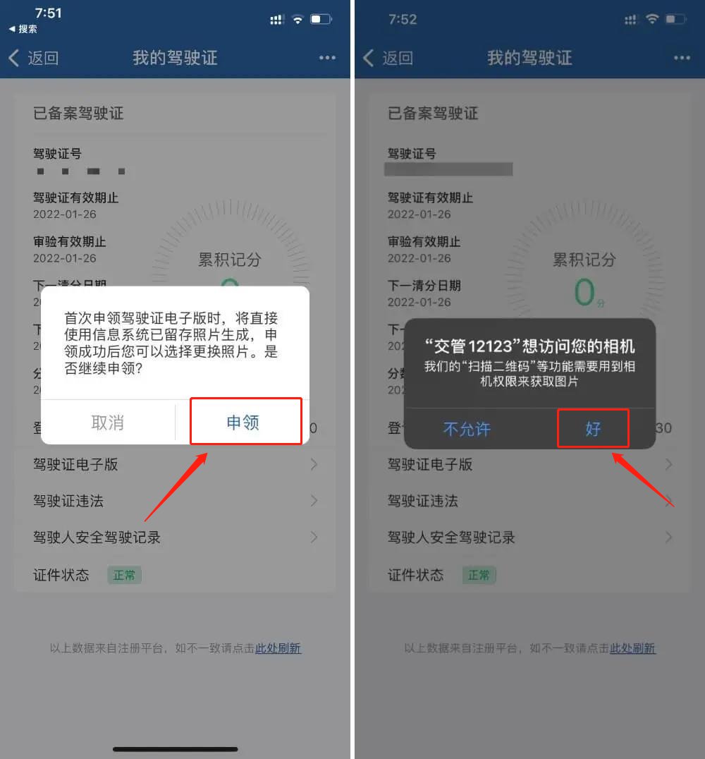 点击「申领」,“交管 12123”APP将申请访问相机权限,点击「好」即可进行下一步。