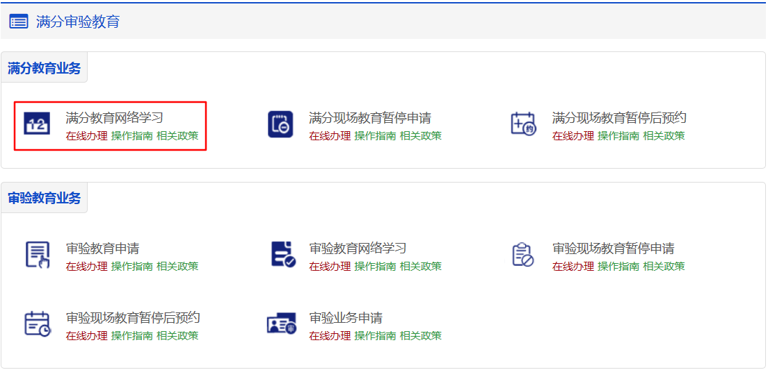 互联网注册用户在互联网登录后,若已申请满分教育现场+网络学习方式,并在当天没有预约现场教育的,可以点击【满分审验业务】→【满分教育网络学习】进入满分教育网络学习流程。