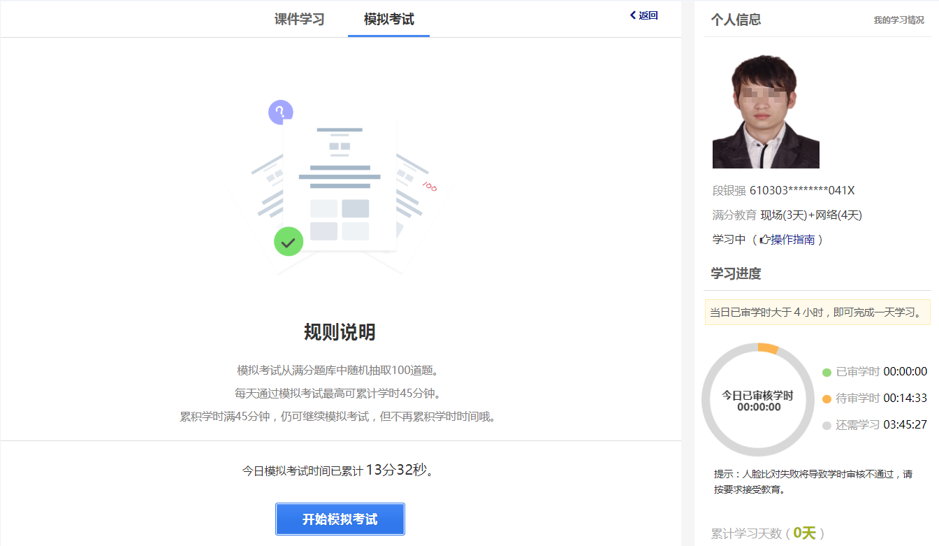 满分网络学习形式包括 视频课件、文档课件、满分模拟考试。学习过程中必须打开摄像头,系统不定时抓拍学习照片, 有异常情形的系统记录嫌疑。当天累计学满 3小时 ,由管理员审核通过后,视为当天教育完成。7天满分教育完成后即可办理预约满分考试。