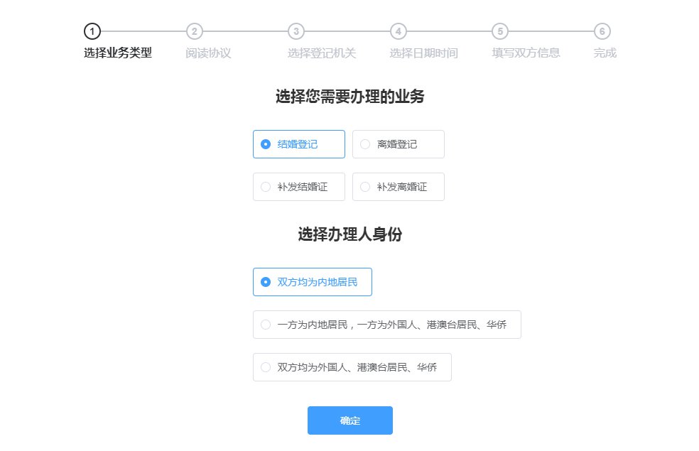 (按照页面显示,可选择”结婚登记、离婚登记、补发结婚证、补发离婚证等业务)