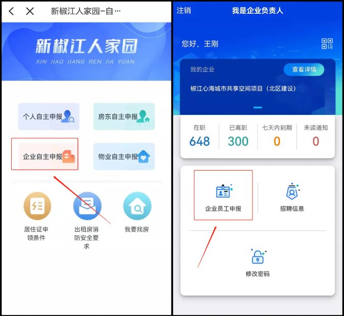 打开浙里办,按顺序点击椒江区→新椒江人家园→点击企业自主申报→进入流动人口社会化管理系统,然后逐步按照以下图示顺序点击。(如图)