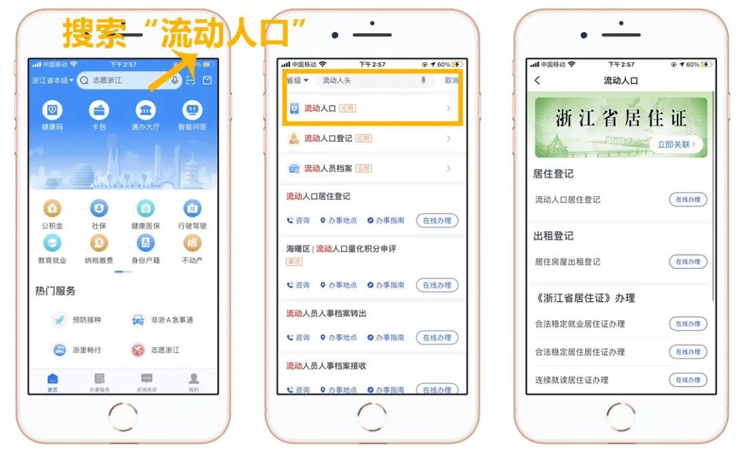 1、下载并登陆注册浙里办APP,搜索“流动人口”,点击进入应用。