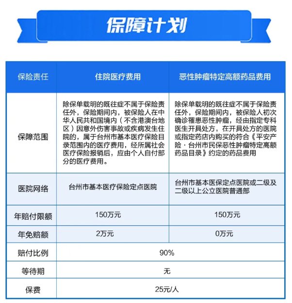保险期间内,被保险人因意外或疾病发生的住院医疗费用,在台州市医保报销范围内,经医保报销后,在符合保险责任的情况下,超过2万元免赔额后(年累计)按90%比例报销,最高报销150万元。(详见投保页面相关约定)