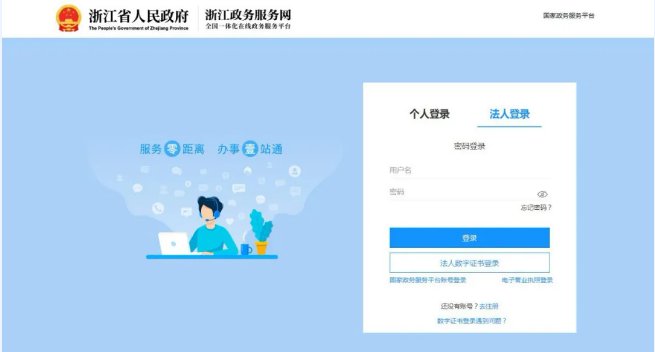 访问网址:http://www.zjzwfw.gov.cn或者百度搜索“浙江省政务服务网”打开“浙江政务服务网”界面,左上角选择“台州市”, 点击网站右上角“登录”按钮,选择“法人登录”。社会保险网报系统如有法人数字证书的可以选择法人数字证书登录,未向工商部门申领法人数字证书的单位用户,点击“去注册”。