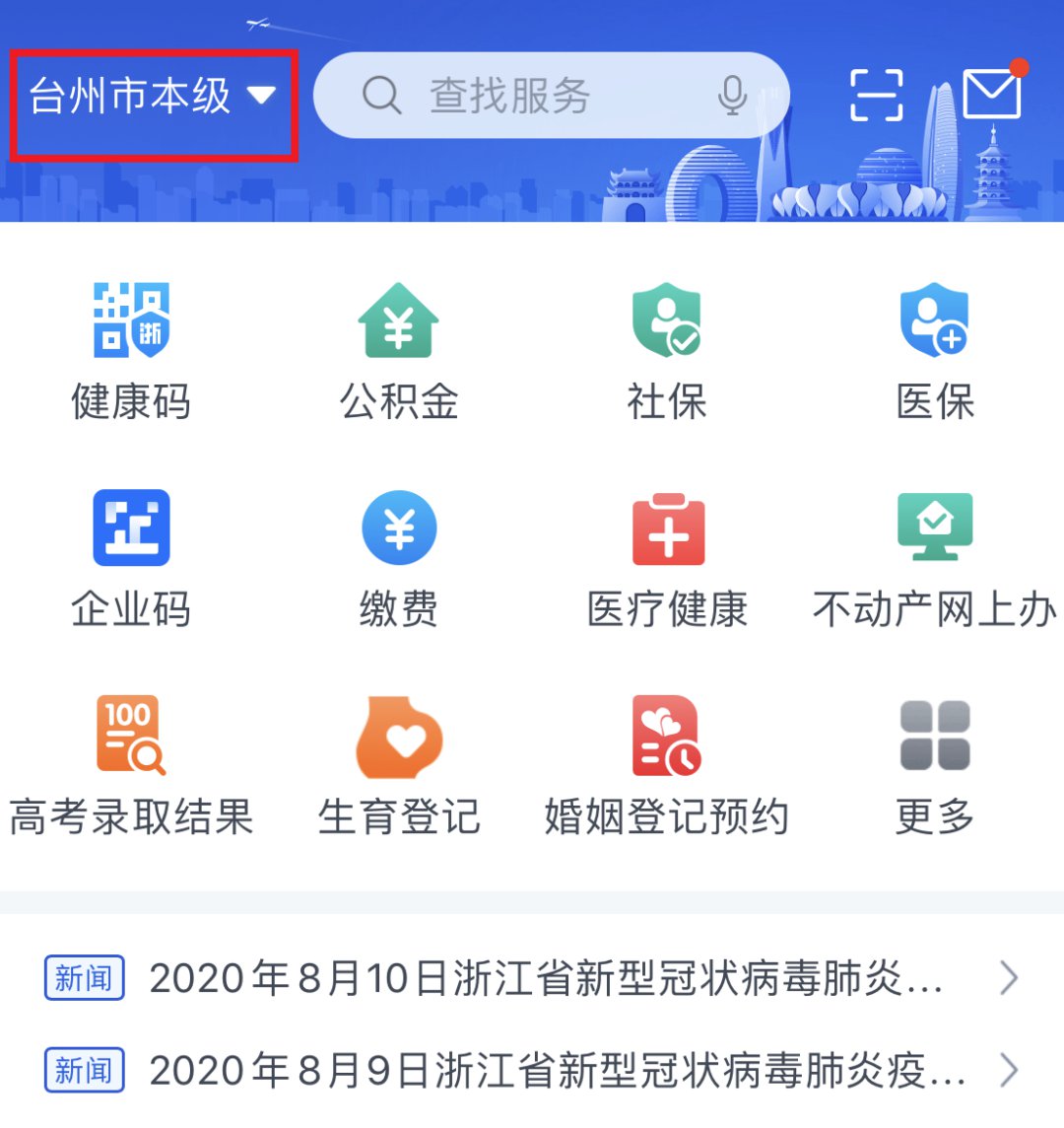 1、登录浙里办个人账户,进入浙里办首页,左上角设置行政区划为“浙江省-台州市”并搜索“台州掌上人社”,进入应用