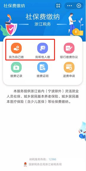 2、进入“社保费缴纳”页面后,有6大功能点,分别是“我为自己缴”“我帮他人缴”“银行缴费协议”“缴费记录”“缴费证明”“退费申请”。(同一支付宝账号每年缴费人数上限20人)