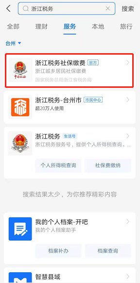 1、支付宝定位“台州”,搜索“浙江税务”—服务项里的“浙江税务社保缴费”,即可进入缴费入口