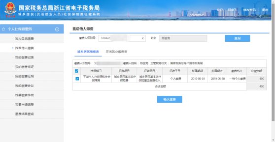 点击左侧任务栏【我帮他人缴费】,输入缴费人识别号(一般为身份证号码),点击回车,弹出姓名。点击查询,剩余步骤参照【我为自己缴费】。