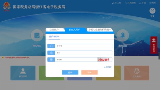 (一)若缴费人已注册电子税务局,点击首页右上方【登录】-【自然人用户】,输入账号(手机号)、密码、验证码,点击登录。