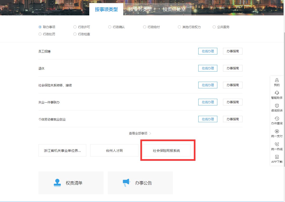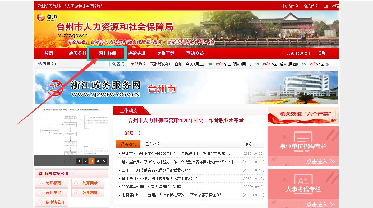 1、进入台州市人力资源和社会保障局官网(http://rsj.zjtz.gov.cn/)点击进入“网上办理”