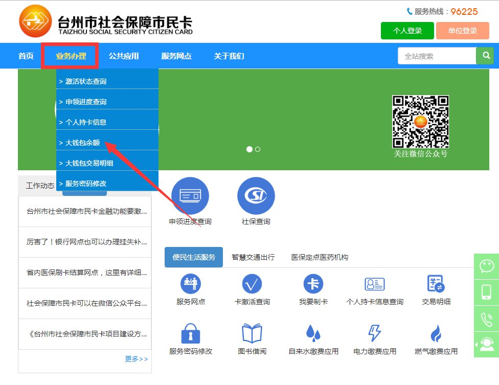 点击进入台州市社会保障市民卡官网,登录后点击“业务办理”,点击“大钱包余额”即可。