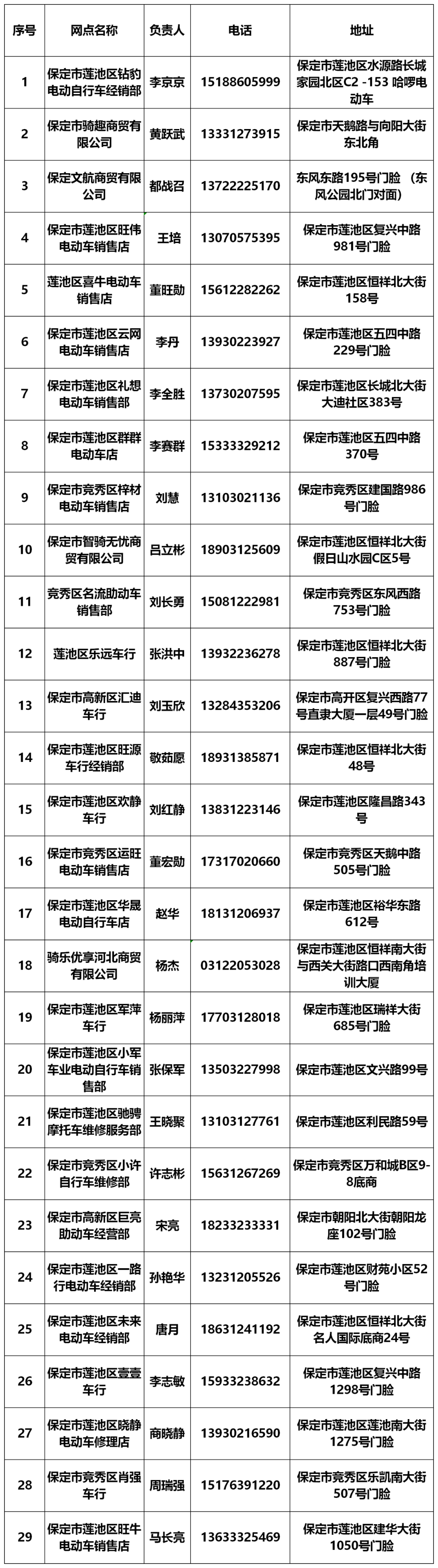 为方便群众办理电动自行车登记上牌业务,保定市主城区(莲池区、竞秀区和高新技术开发区)于2022年5月2日开通部分线下电动自行车登记服务网点。