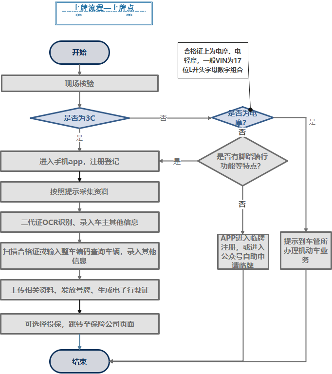 线下APP办理:现场上牌网点——现场核验车辆——进入手机APP,注册登记——采集、录入相关信息——发放号牌——可选择投保——结束。
