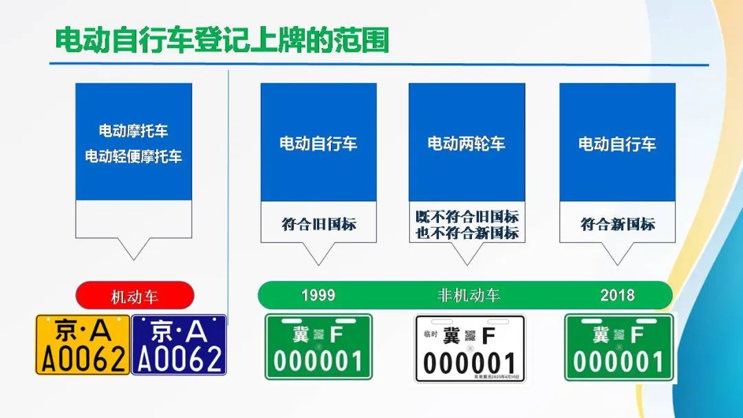 登记上牌的范围是所有电动自行车,包括符合强制性国家标准的电动自行车和不符合国家强制性国家标准的电动自行车。但不包括属于《道路机动车辆生产企业及产品公告》管理范围的电动摩托车(含电动轻便摩托车)、不属于电动自行车的电动滑板车和电动三轮车等车型。