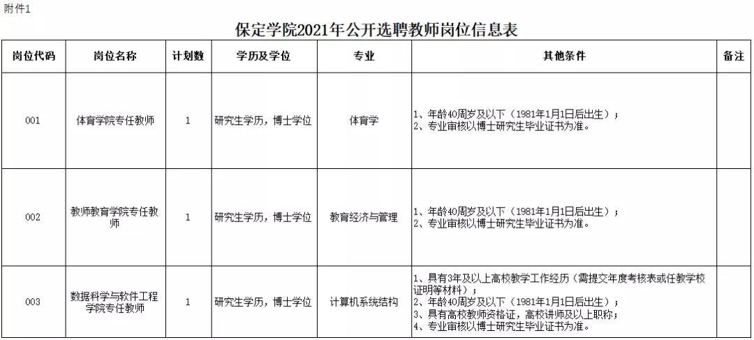 二、选聘岗位、专业、名额及应聘岗位所需要的具体条件见《保定学院2021年公开选聘教师岗位信息表》,同时符合下列基本条件: