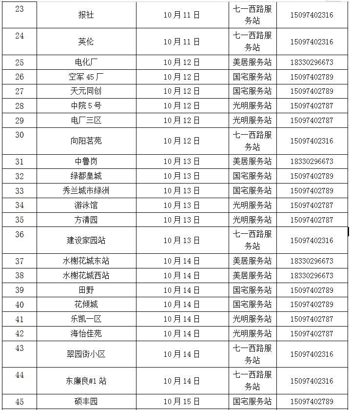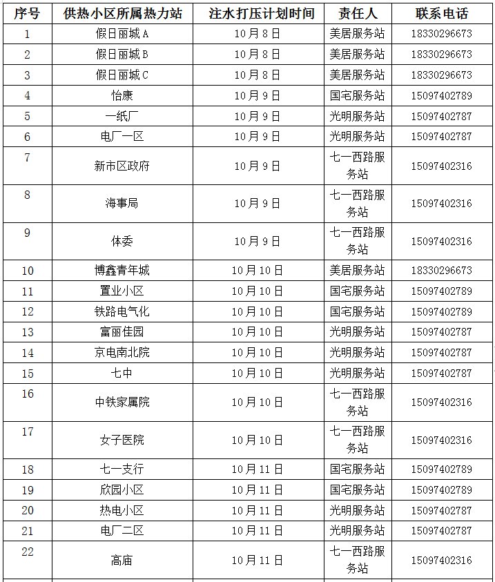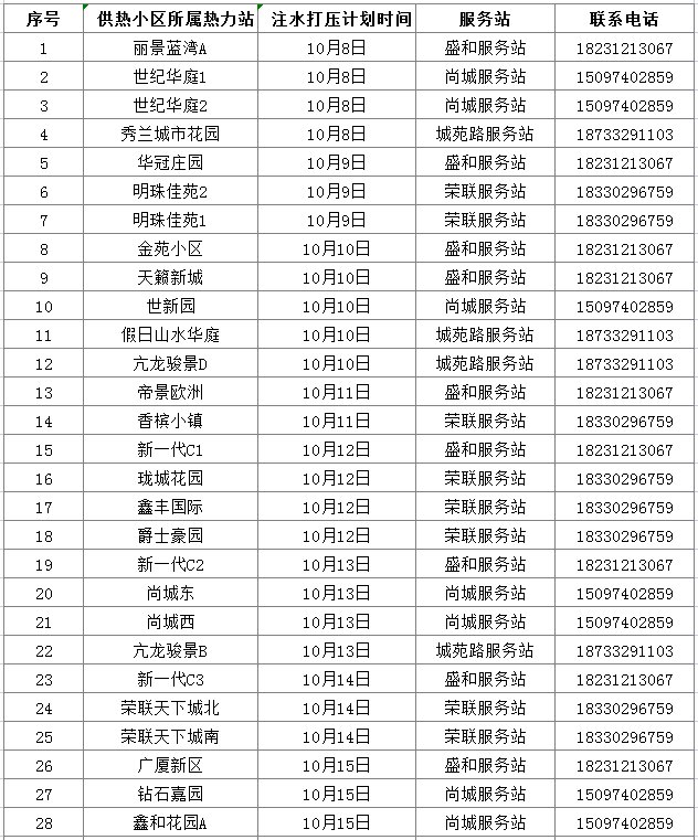 以上计划表仅作为部分小区注水试压时间说明,具体时间以纸质通知单为准,请热用户及时关注小区单元门口或告示牌张贴的注水试压通知。