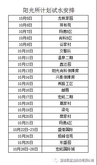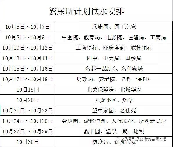 为做好2021-2022供暖季的供热工作,我公司计划于10月份开始对小区庭院管网及室内采暖设施进行注水、打压作业(具体时间安排见下表)。时间如有变更,我公司会提前张贴更改通知,并以更改后时间为准。系统一旦注水将会保持带压状态直至供热,请不要拆动采暖设施,以免造成不必要的损失。
