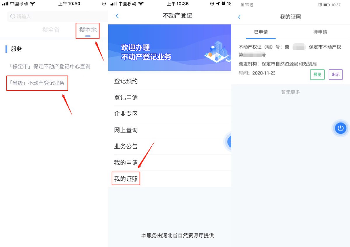 不动产登记电子证照颁发后,权利人可通过登陆“冀时办APP”搜索“不动产登记业务”进入我的证照模块查看不动产登记电子证照。加盖电子印章的不动产登记电子证书、证明与纸质不动产登记证书、证明具有同等法律效力。