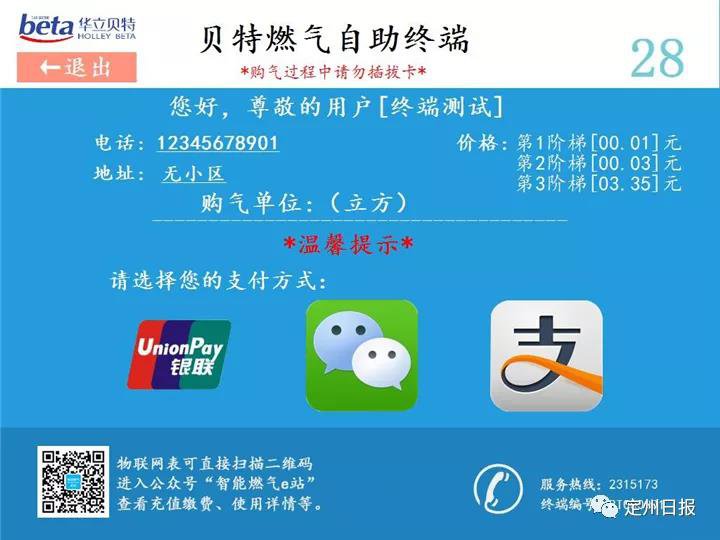 目前,自助终端缴费仅支持贝特卡IC卡用户,缴费时需选择“IC卡燃气表”,然后通过读用户卡,获取天然气用户基础资料,确认无误后选择需要购气的燃气方数,并选择微信支付,即可完成缴费。