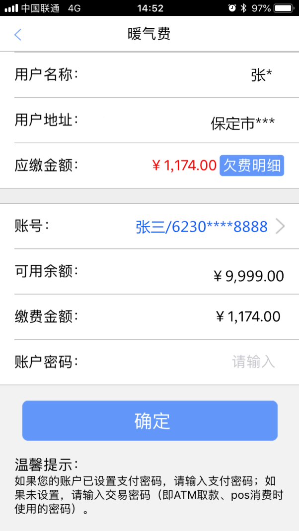 (5)系统自动查询出用户应缴费信息,选择缴费河北银行账号后,输入银行支付密码,点击“确定”按钮,确认缴费信息后,缴费成功。