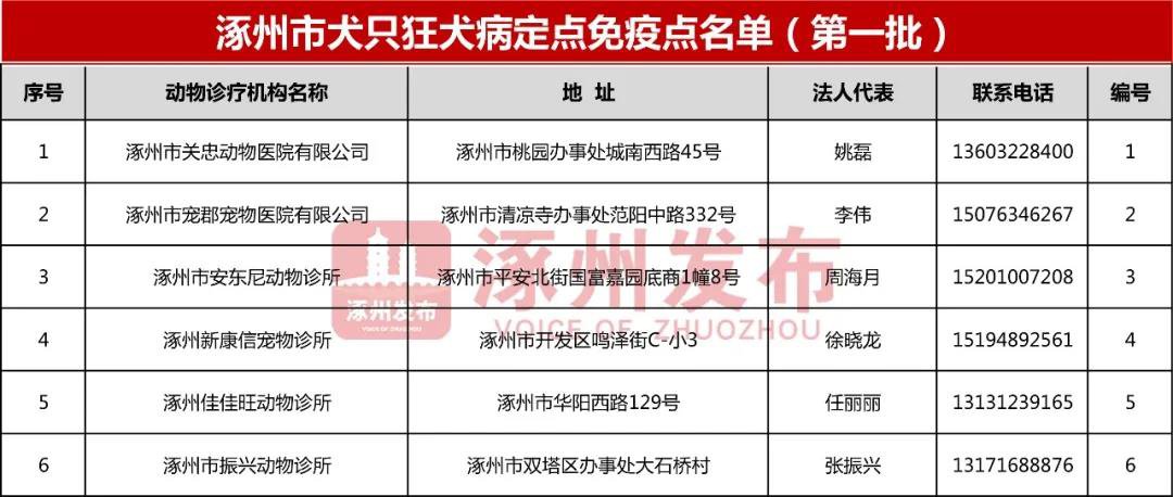 根据《涿州市人民政府办公室关于印发<涿州市养犬管理集中整治专项行动工作方案>的通知》(涿政办发[2020]38号)、《涿州市农业农村局关于开展全市犬类狂犬病定点免疫点申报工作的通知》(涿农字[2020]86号)等文件要求和精神,经我市各动物诊疗机构自愿申报,市农业农村局组织相关动物防疫分站进行材料审核和现场验收,认定以下6家动物诊疗机构为涿州市第一批犬只狂犬病定点免疫点,现公布如下,希望广大群众积极配合,做好犬只狂犬病免疫监测工作并及时到公安部门进行犬只登记。