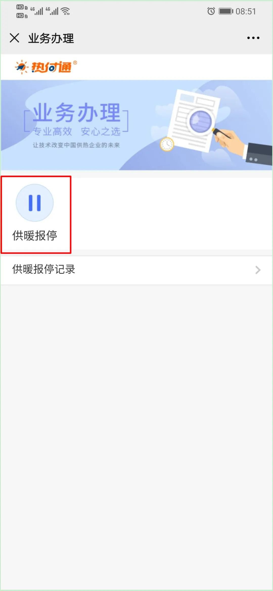 3.进入业务办理界面,点击下方“供暖报停”。