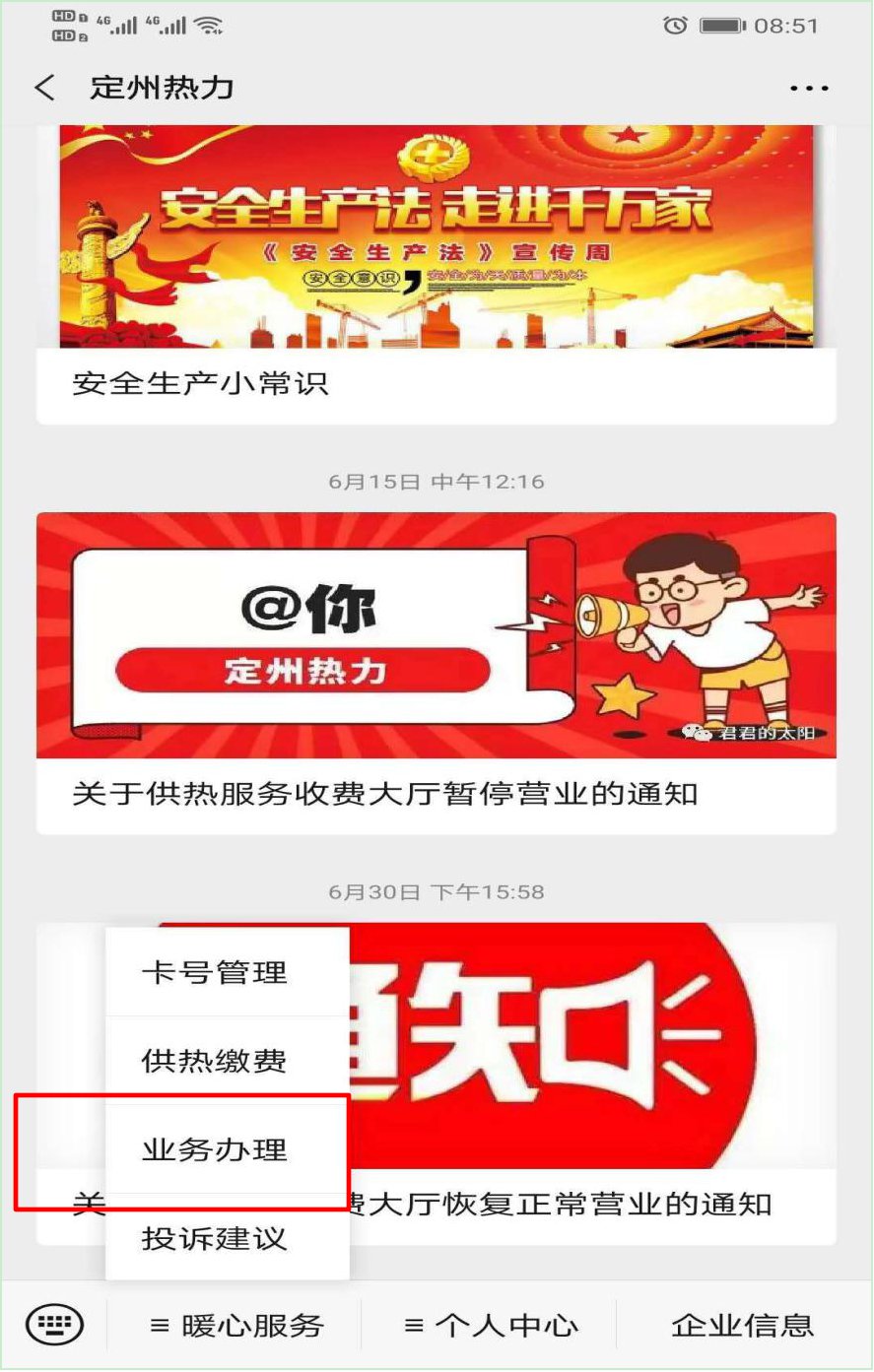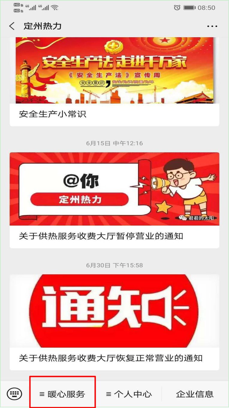 1.进入“定州热力公众号”,点击左下方“暖心服务”。